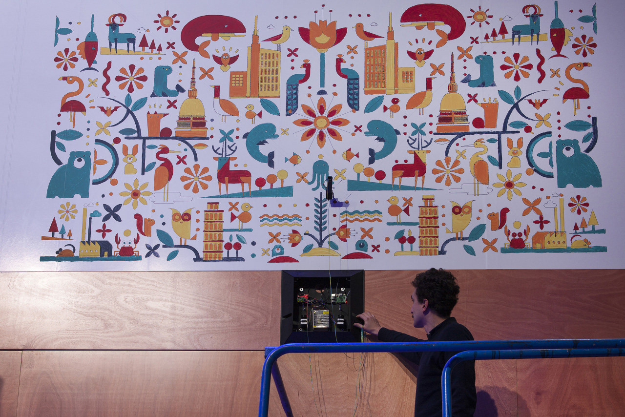This was the result, painted on the wall by vertical plotters and coloured live by a couple of assistants.
